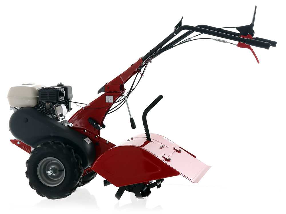 Il dispose d’une traction sur roues pneumatiques creusées avec profil tractor qui garantissent une très bonne traction sur des terrains plutôt plats, sans cailloux et souples ou déjà travaillés. La largeur totale limitée assure une bonne maniabilité, même dans des espaces très réduits tandis que les systèmes de sécurité efficaces appliqués au motoculteur et le frein automatique de stationnement garantissent un maximum de sécurité.